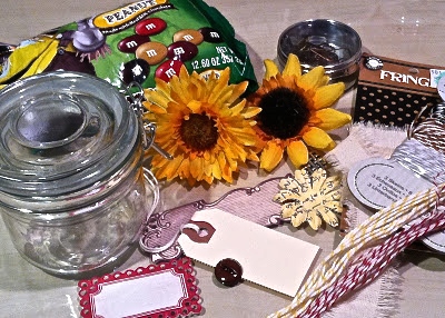 Gather a small recycled or mason jar with a lid, a package of seasonal candy, and embellishments including twine, fringed fabric or ribbon, flowers, tags and labels.